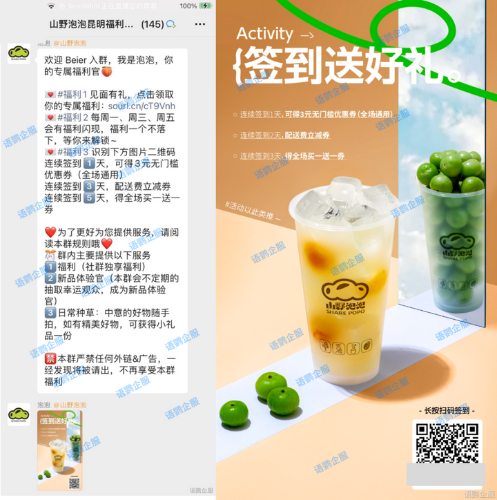 社群裂变:企业可以利用语鹦企服的「社群裂变」功能,设定裂变活动规则,激励客户生成个性化海报并邀请朋友扫码进入社群。当客户成功完成裂变任务后,即可解锁特定活动奖励,从而提高企业社群成员数量,达成社群裂变的目标。例如薄荷森林以“邀请新人进群1元喝茶饮“的活动作为开店福利,鼓励用户分享活动页面获得奖励,从而实现用户裂变。