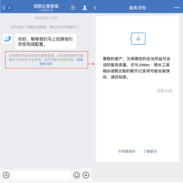 不过,企业微信目前引入了「会话存档功能」,旨在监管员工与客户的聊天记录,以应对销售飞单、接私单、恶劣服务态度等问题。这项功能是需要双方在聊天开始前同意才可启用,当员工首次添加外部联系人或首次向已开通存档的客户发起聊天时,客户会收到一条消息提醒,告知其聊天内容将被存档,并默认同意存档。如果客户希望拒绝存档,可以点击“查看服务须知”拒绝即可。