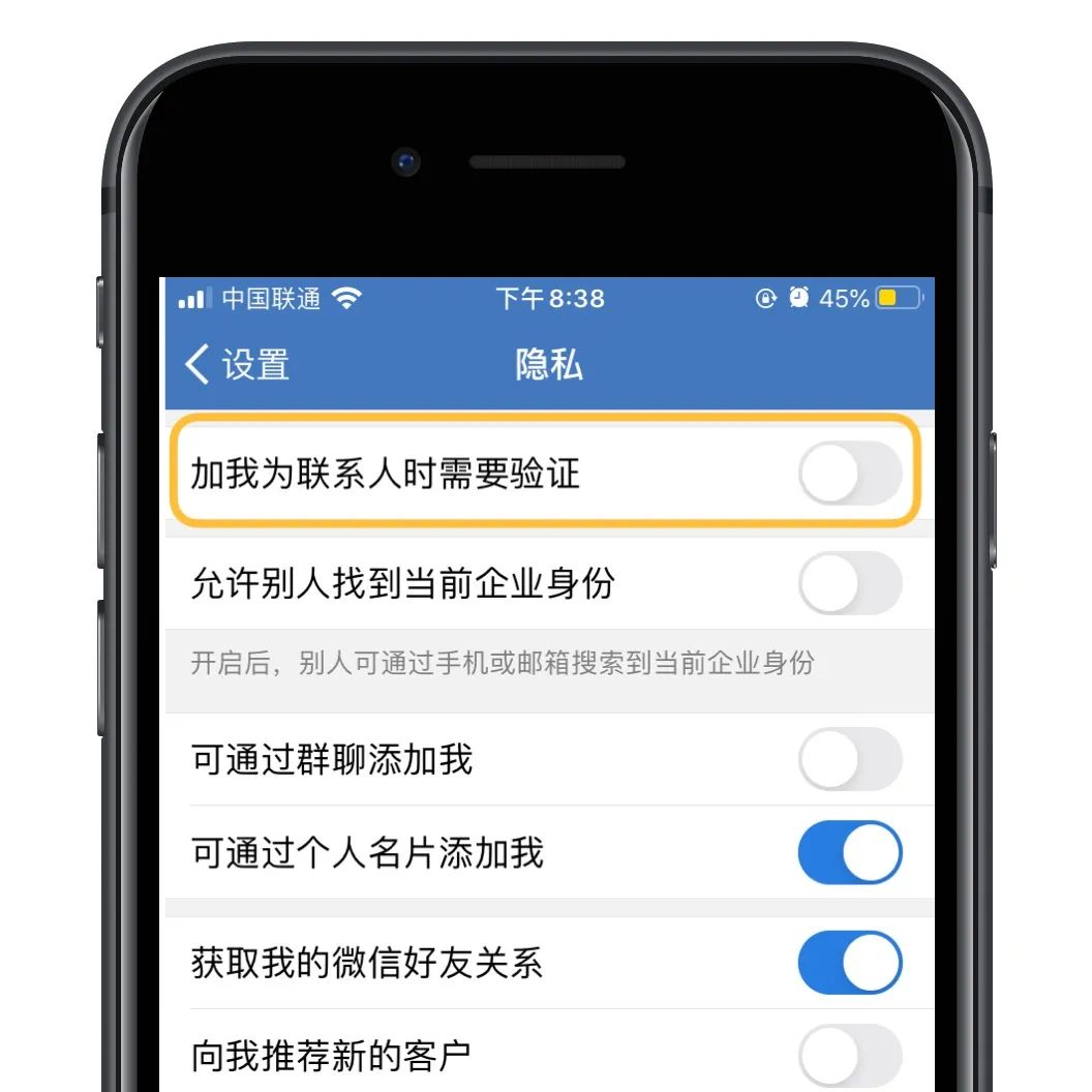 企业微信自动通过好友的功能,我们可以在企业微信手机App,打开『我』-『设置』-『隐私』-『加我微联系人时需要验证』,把右边的开关改为『关闭』状态即可,如图所示。这样下次别人加我们好友的时候就可以自动通过了哦。