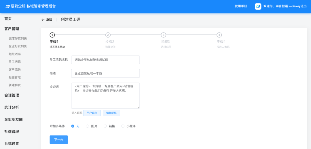 借助语鹦企服员工活码,还可以进一步实现不同活码带不同顾客昵称的欢迎语、自动拉群、自动打标签等丰富的功能。