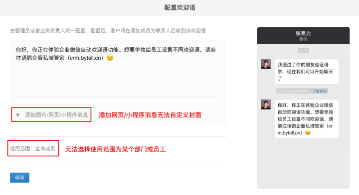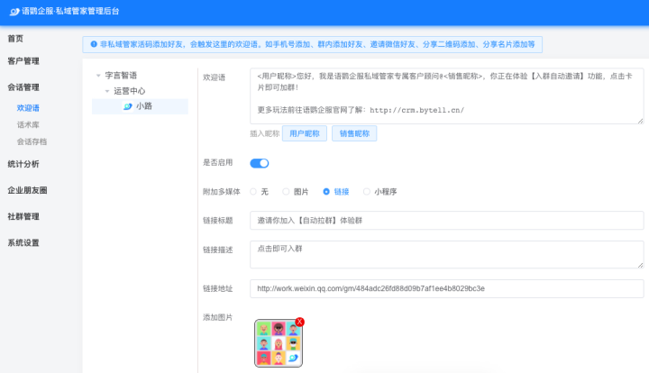 想要解决单独欢迎语的问题,就要用到语鹦企服欢迎语功能。不仅可以按部门、按员工单独设置,还可插入客户昵称和销售昵称,并支持网页/小程序消息自定义封面,功能更加灵活。