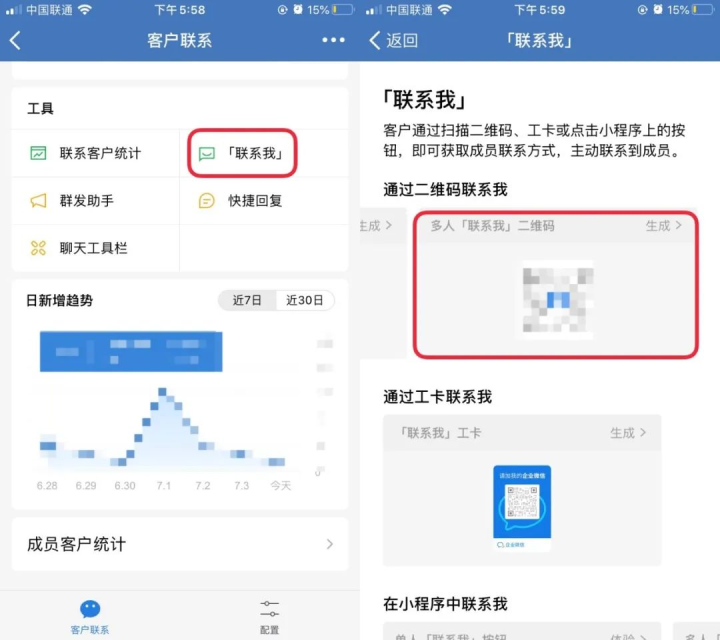 企业微信可生成「联系我」二维码活码名片,支持一码多人,可用于多客户分流场景,但不支持一人多渠道,因为无法区分渠道客户数据,就失去了渠道统计的意义了。