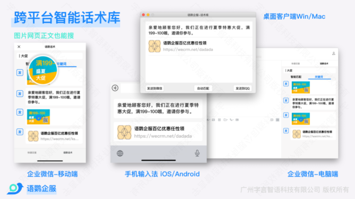 只需要将语鹦话术配置到聊天侧边栏,点一下就可以快捷回复客户,还可给不同部门设置不同的回复话术,让话术标准化。