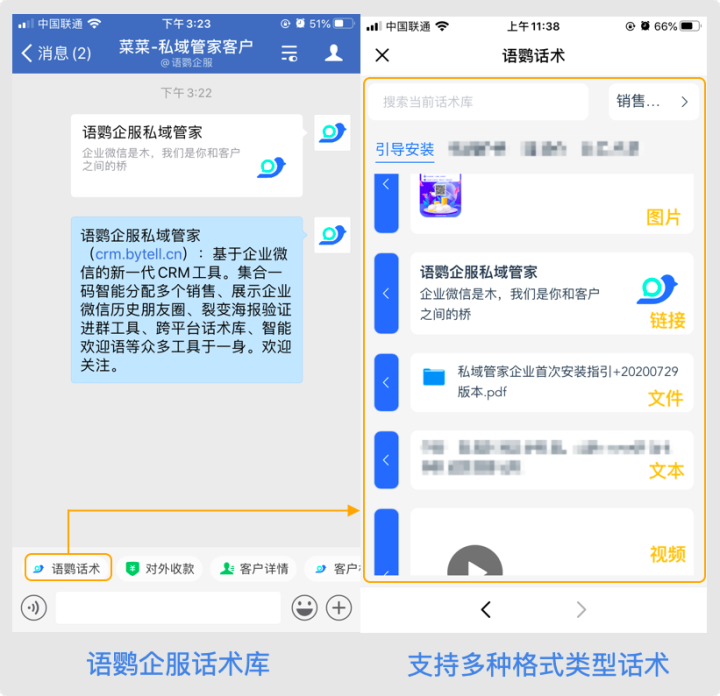 语鹦企服私域管家(crm.bytell.cn):基于企业微信的新一代CRM工具。集合一码智能分配多个销售、展示企业微信历史朋友圈、裂变海报验证进群工具、跨平台话术库、智能欢迎语等众多工具于一身。欢迎关注。