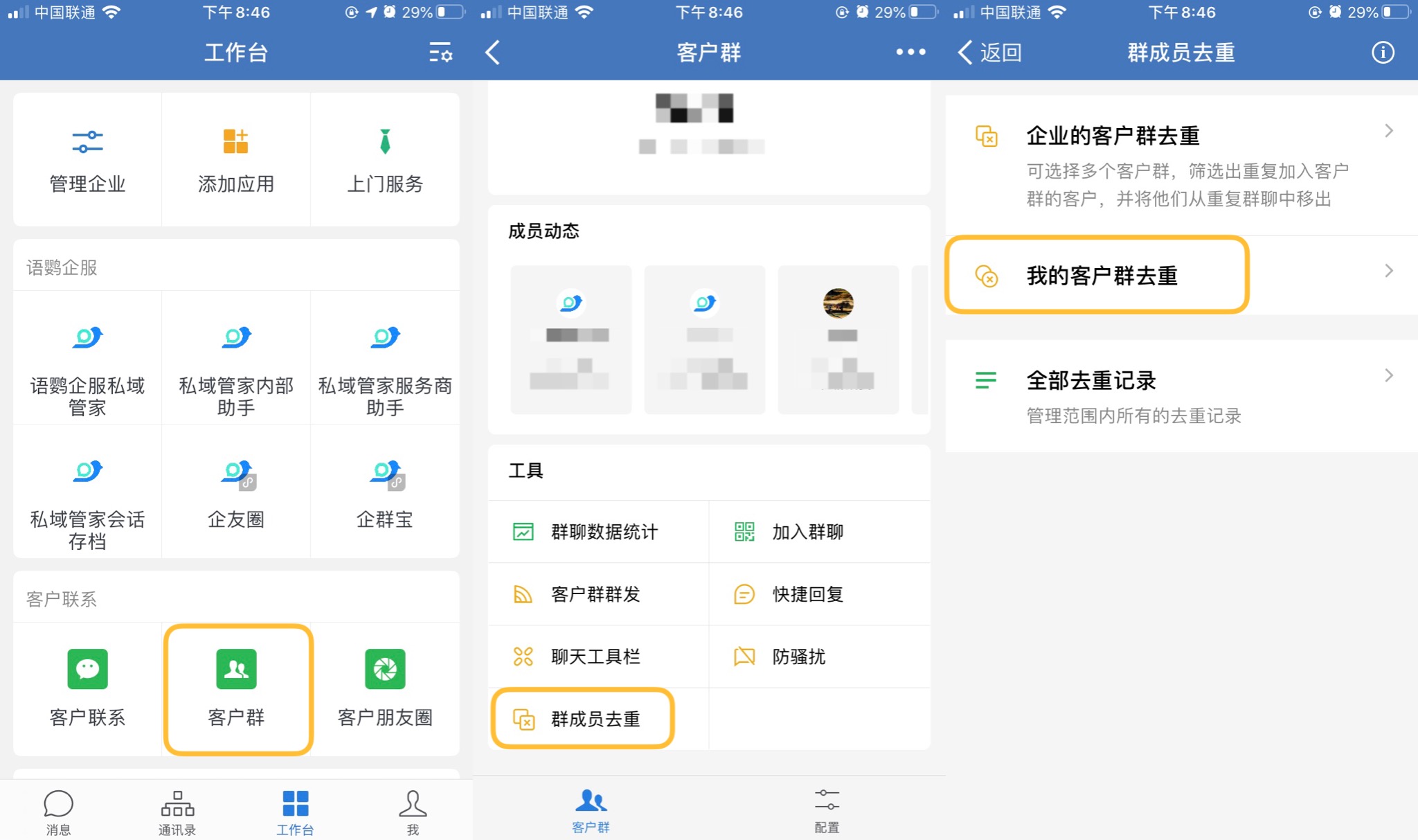 手机端:有客户联系权限的员工,打开企业微信App,依次点击-工作台-客户群,在工具模块找到「群成员去重」,点击「我的客户群去重」。