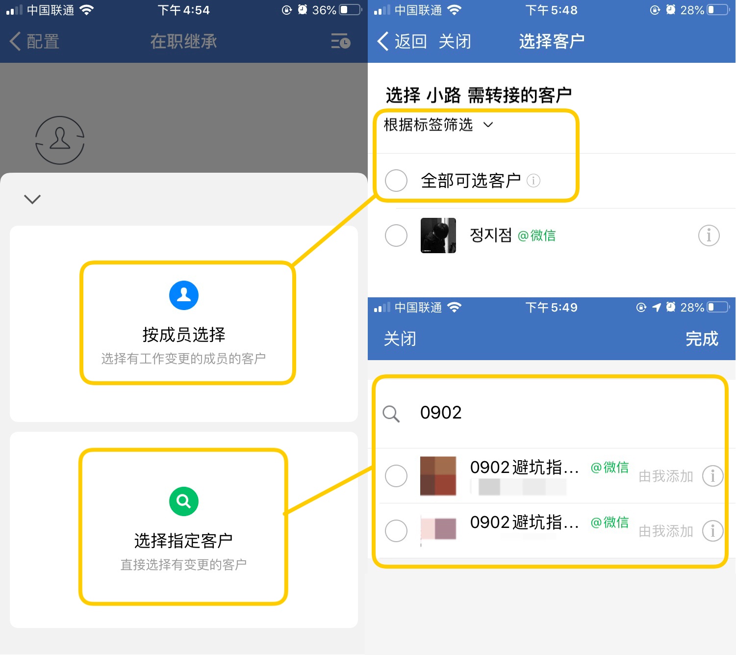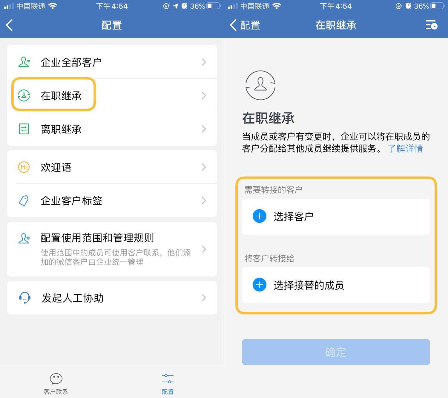 当成员或客户有变更时,企业可以将在职成员的客户分配给其他成员继续提供服务。怎么操作呢?只需点击【在职继承】,【选择客户】并【选择接替的成员】,点击确定即可。