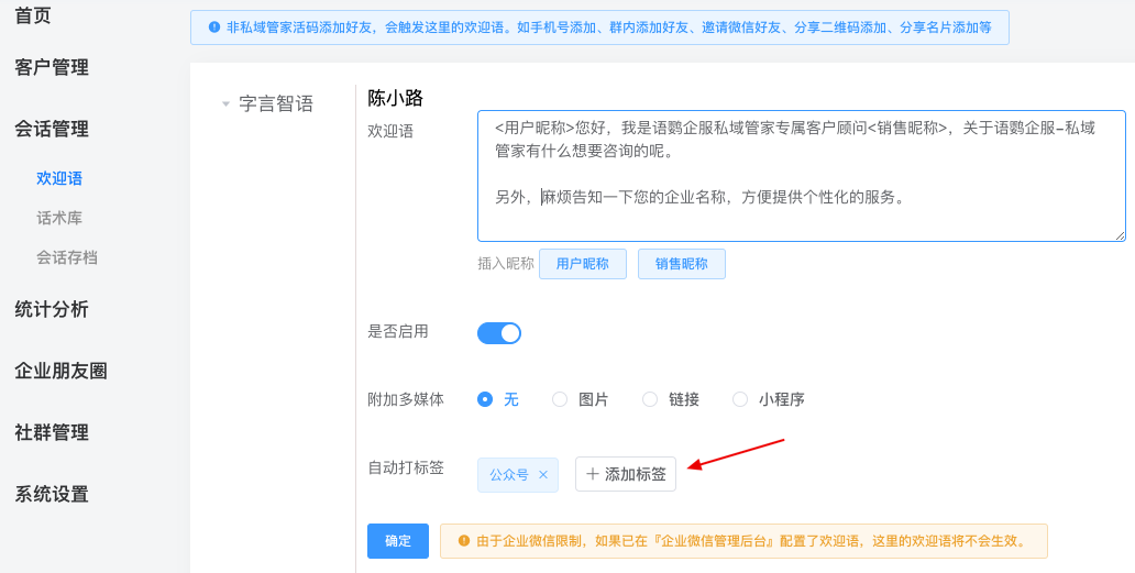 登录语鹦企服管理后台,点击【会话管理-欢迎语】,选中要配置单独欢迎语的成员(如陈小路),按提示添加欢迎语和多媒体附件,并添加要自动给客户打上的标签。
