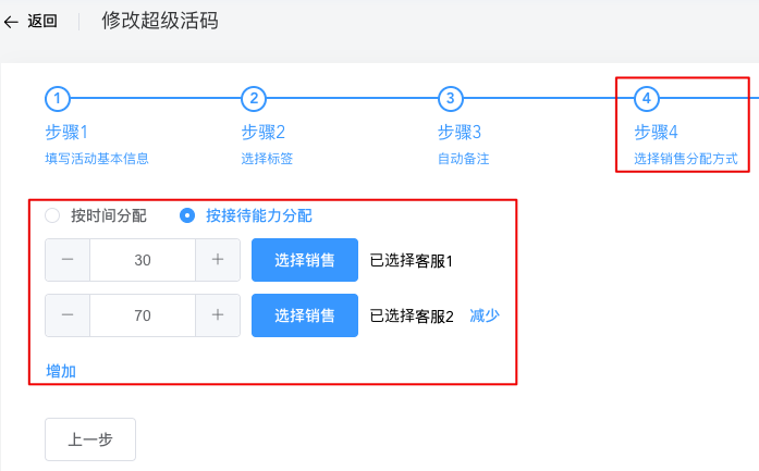 使用时,只需在超级活码步骤四选择【按接待能力分配】,并按提示填写信息即可。如图所示,设置后,前30个客户扫码会加到客服1,后70个扫码会加到客服2,如果超过了设定人数,还可以动态增加接待员工。