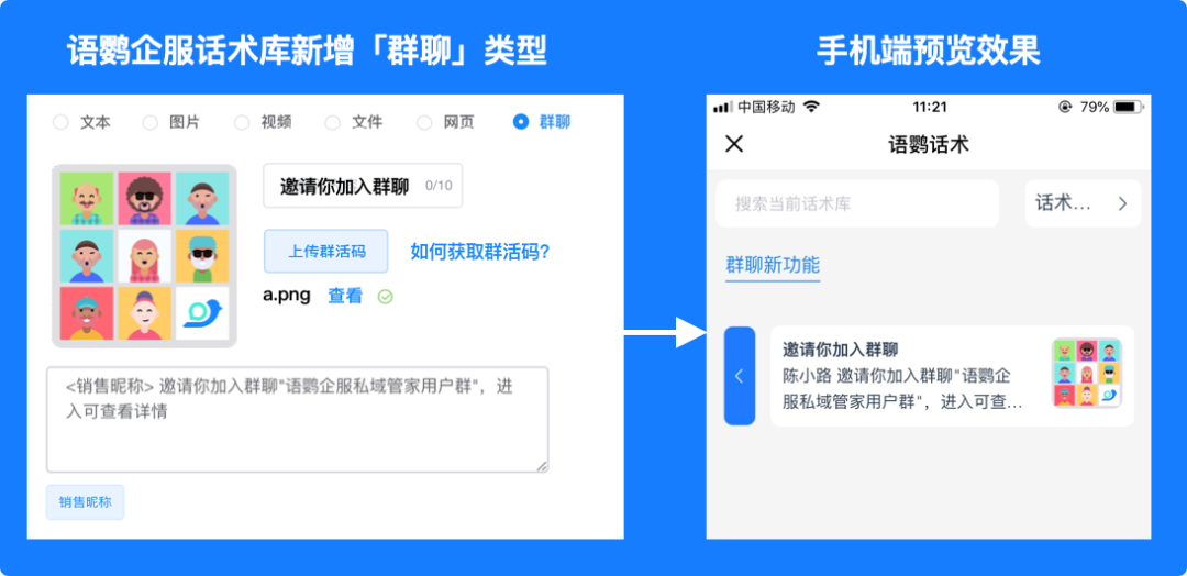 想要快速邀请客户进群,可以把群聊插入到语鹦企服话术库中。这是近期语鹦企服话术库新增的邀请进群话术功能,只需选择「群聊」类型话术并上传活码,即可自动生成入群邀请链接,快捷邀请客户进群。