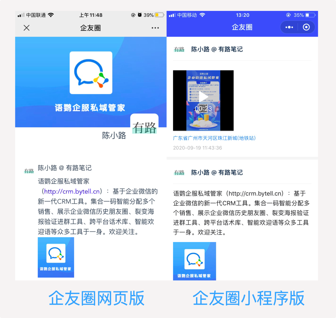 开启后网页版效果图如下左图,与微信朋友圈类似。右图则是小程序版本历史朋友圈,相对体验更流畅,如果企业对打开朋友圈的流畅度有要求,建议选择小程序版本哦。