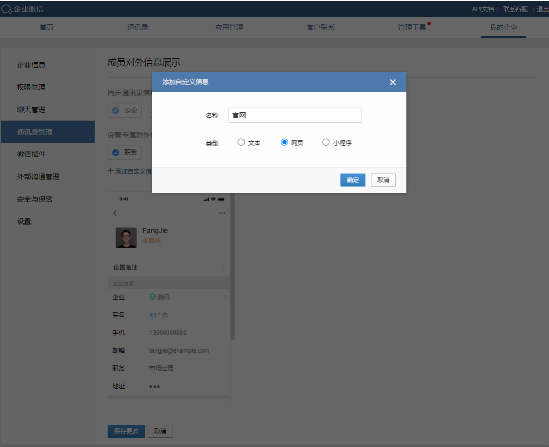 管理员登录企业微信后台 ,进入【我的企业】-【通讯录管理】-【成员资料显示】-【对外资料显示】- 【修改】-【添加自定义信息】页面。