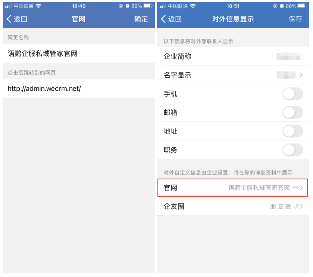 完成以上2步配置后,企业微信好友或微信客户点击员工名片,即可直达企业官网。其他自定义字段也是类似的配置方法。