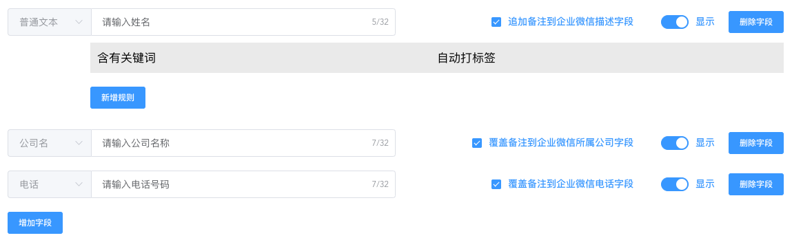1.字段类型及内容:字段类型目前支持普通文本、公司名和电话,其中普通文本类型字段可设置关键词自动打标签规则。
