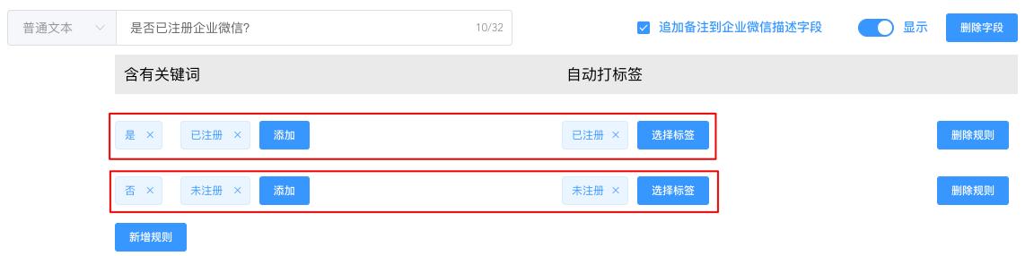 如图所示,企业可根据客户可能填写的内容设置规则,当含有关键词时,就会自动给客户打上对应的标签,标签在客户名片上显示,便于工作人员查看用户画像。
