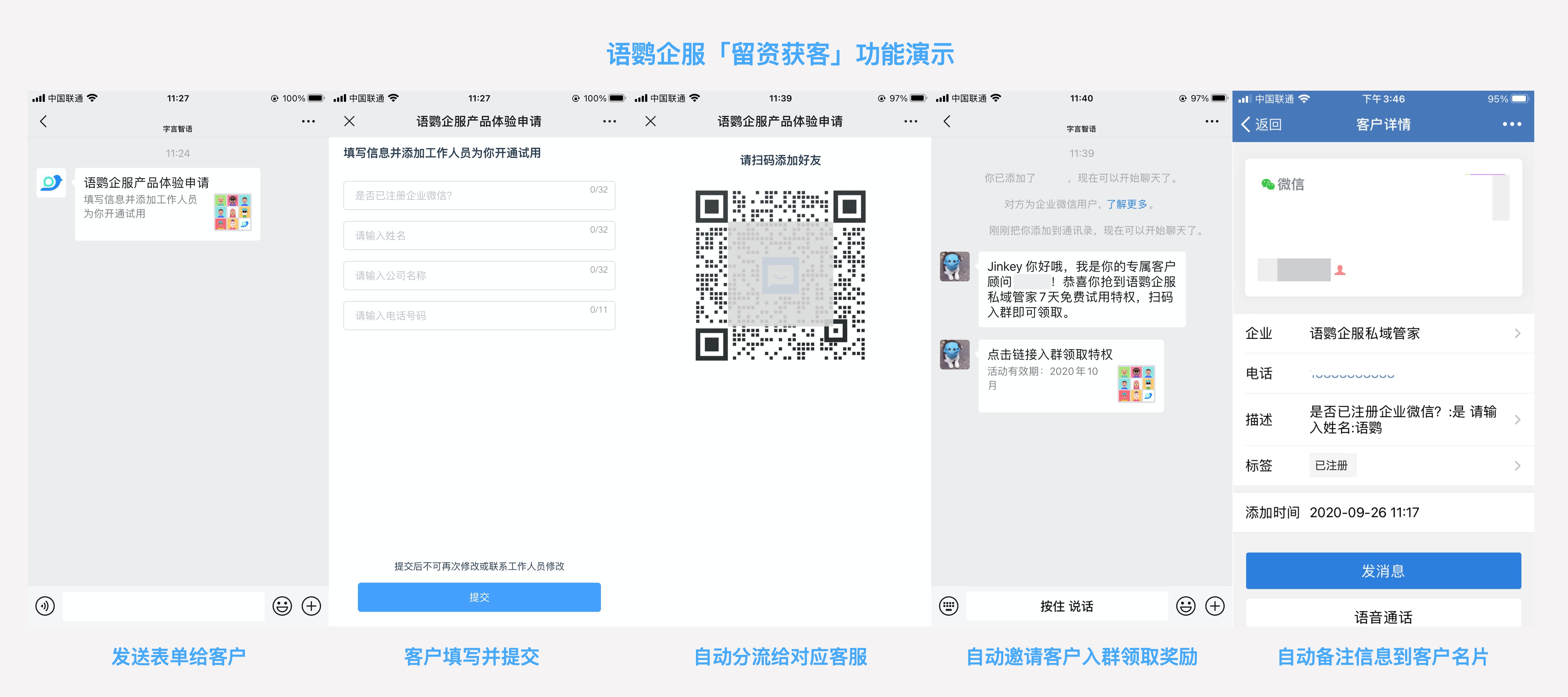 使用语鹦企服留资获客功能,客户填写手机号等信息后,即可自动分流到对应的客服或群聊,而客服会自动发送对应的福利或入群邀请欢迎语,并将表单信息自动备注到客户名片,实现自动化获客及转化。