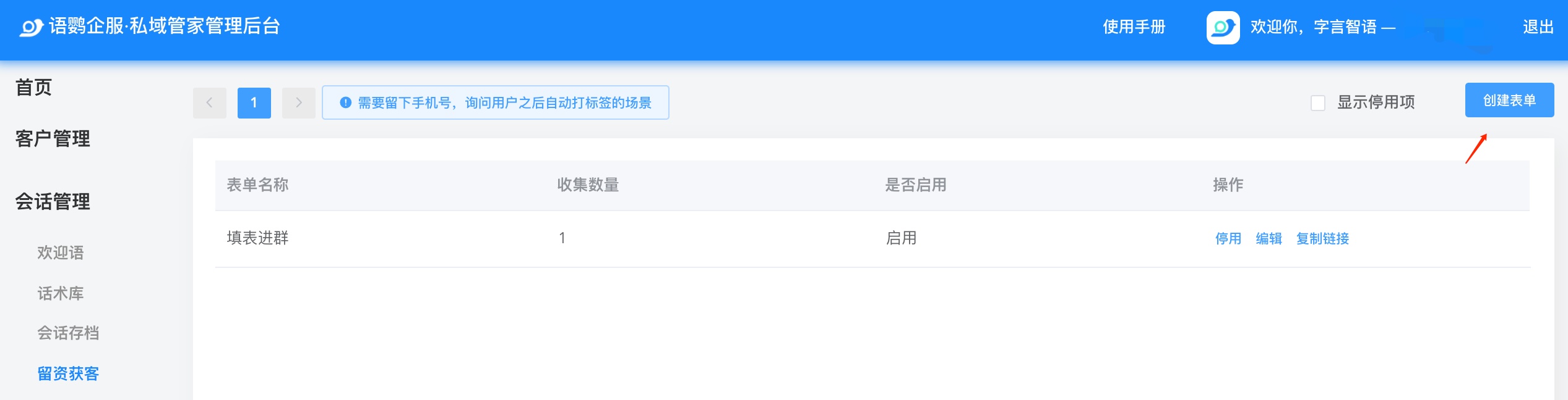 登录语鹦企服私域管家管理后台,点击留资获客,创建表单,按提示填写基础信息并设计表单。