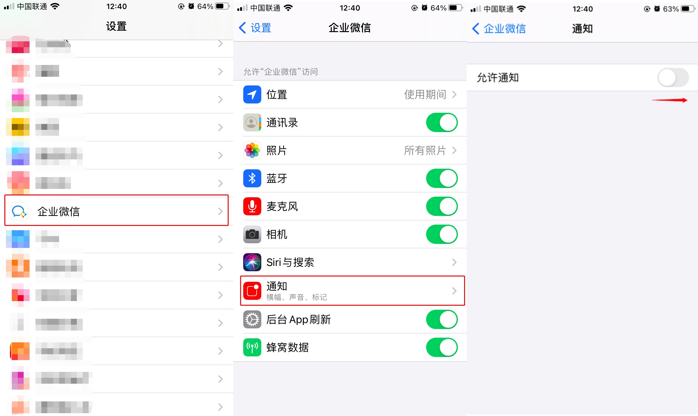 首先打开「设置」 – 下滑选择「企业微信」,然后「点击通知」 – 右滑打开「允许通知权限」即可。