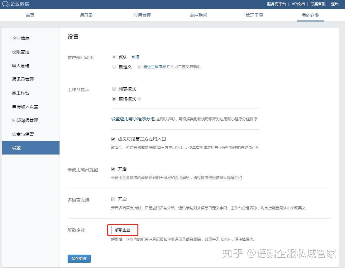 其次,企业微信创建人登录企业微信管理后台,在【我的企业】-【设置】页面即可看到【解散企业】按钮,点击后验证即可解散企业。