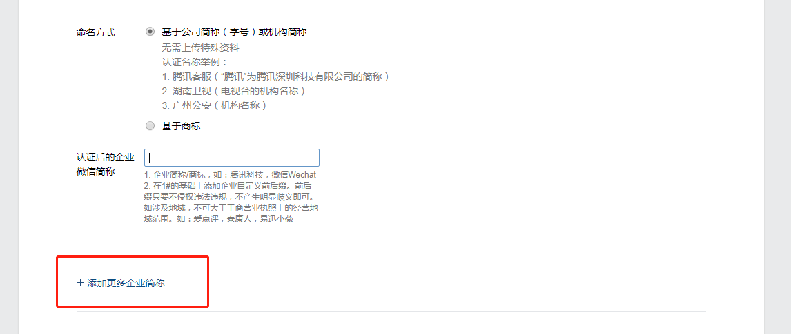 点击【企业微信认证】后,会进入企业微信认证流程,可以看到「添加更多企业简称」按钮,点击即可添加多个简称。