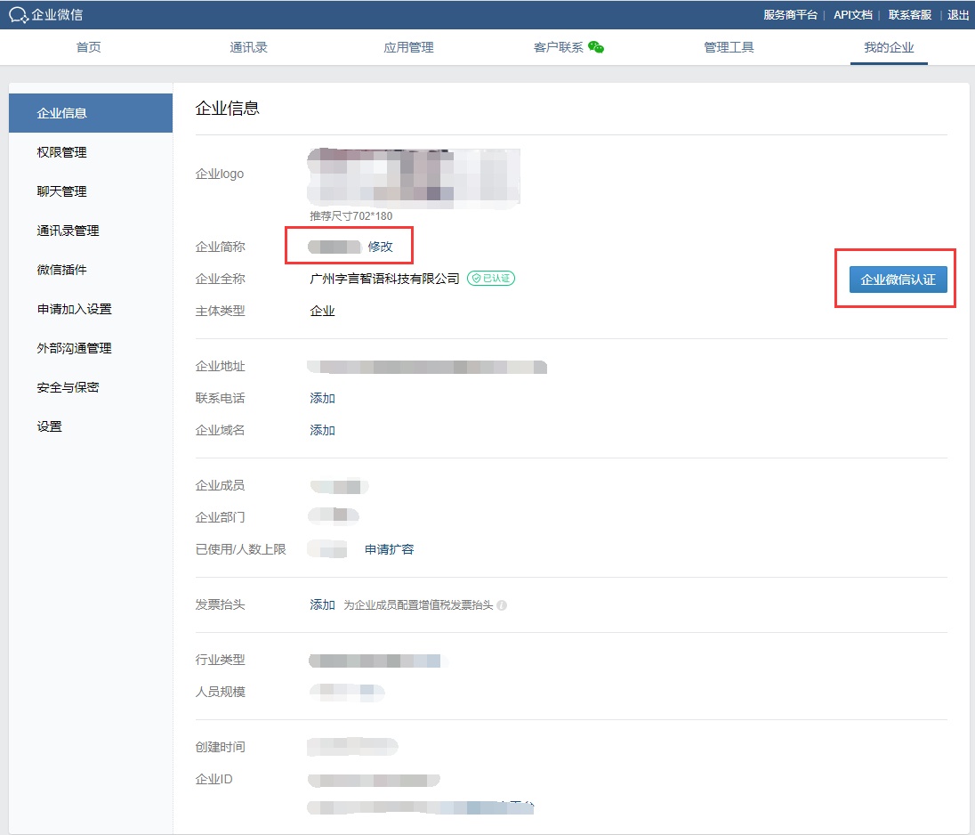 - 企业简称的删减都需要通过重新认证企业微信来实现