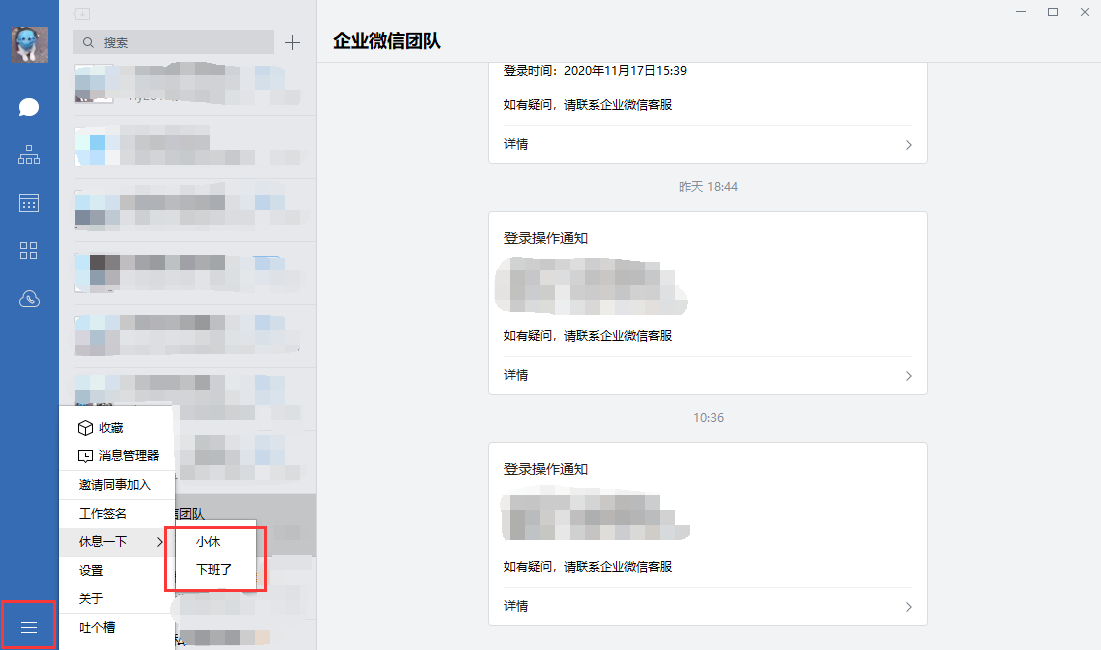 首先打开企业微信APP,点击右上角的「+」号 – 「休息一下」,然后选择小休或者下班了,这样接收到同事的消息久不会提醒了。