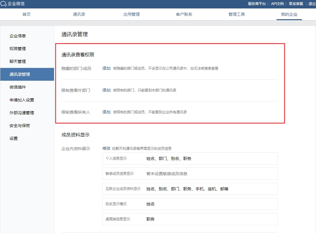 如下图所示,管理员登录企业微信管理后台,在「我的企业」 – 「通讯录管理」页面,找到「通讯录查看权限」