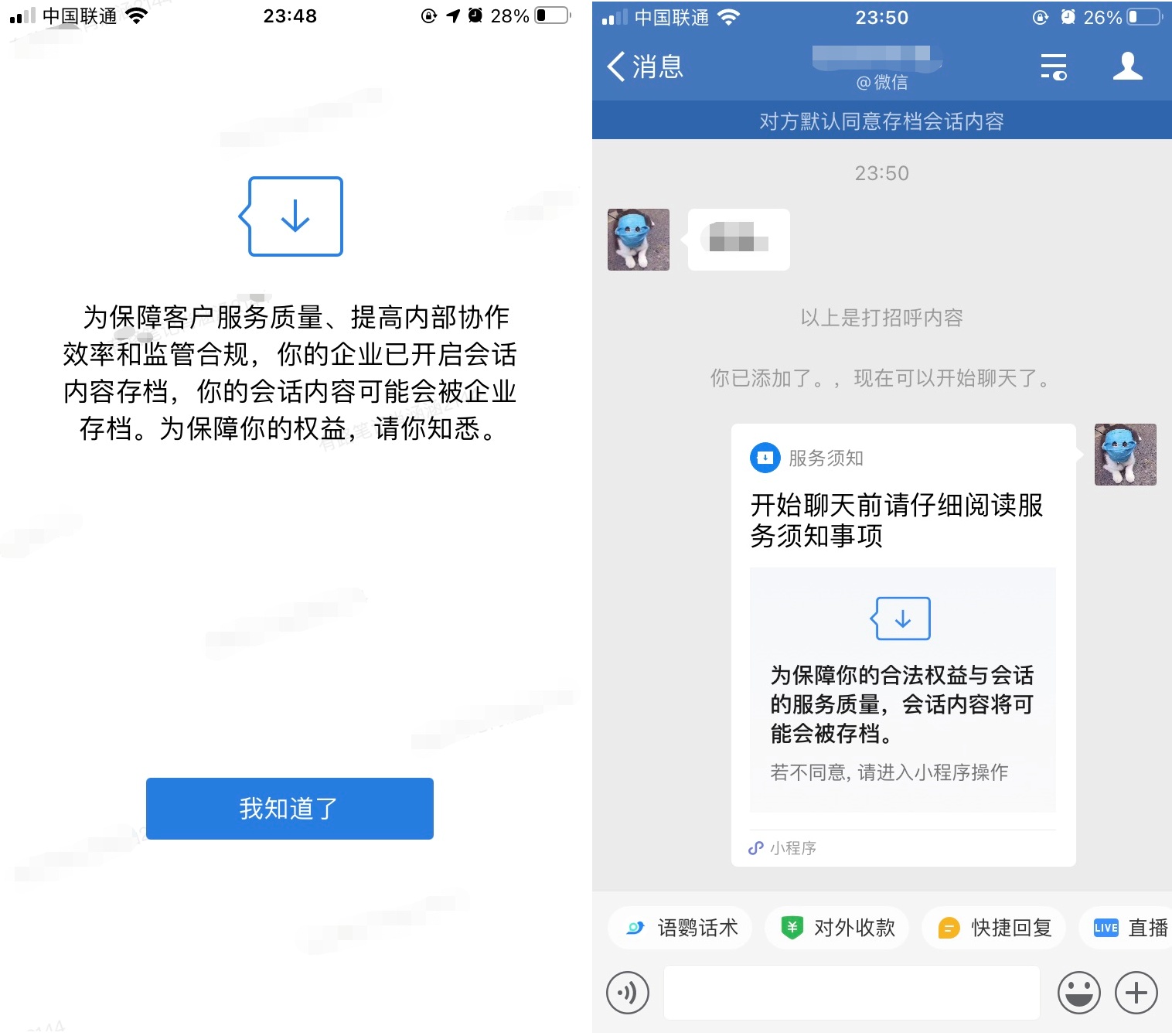 当管理员给员工开通会话存档后,员工每次进入企业微信会弹出一个会话存档提示框,并且首次与客户聊天时,也会在聊天窗口弹出一个会话存档小程序。