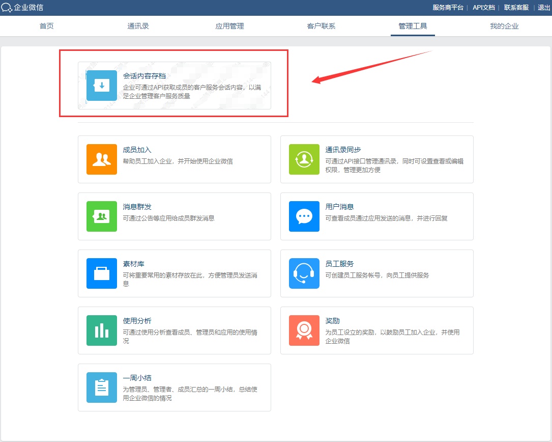 首先登录企业微信管理后台 ,在「管理工具」模块进入 「会话内容存档」,即可开通免费体验或购买。