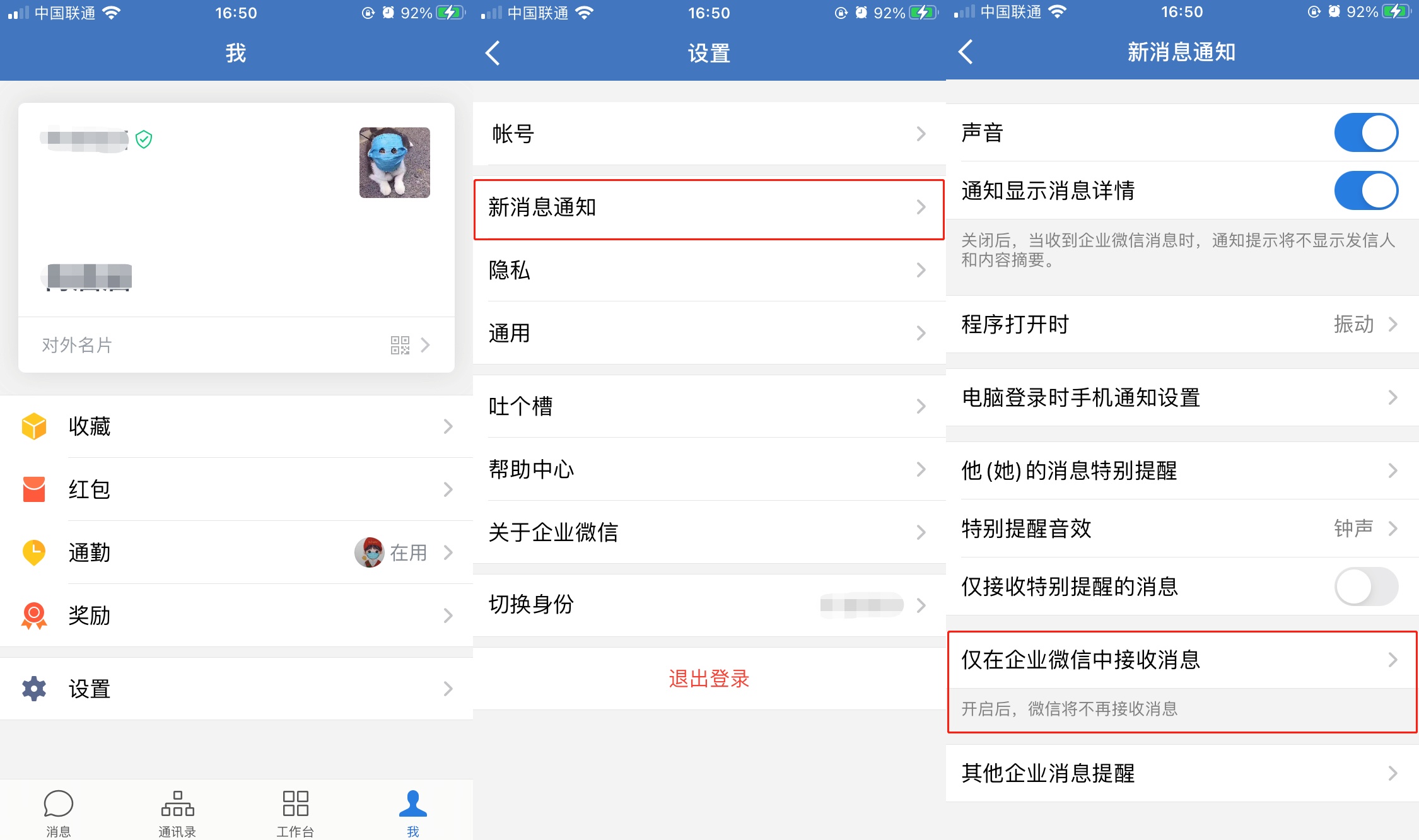 当我们通过微信插件实现了个人微信接收企业微信消息时,有些小伙伴却发现消息还是没有同步过来,是什么原因呢?其实是因为打开了「仅在企业微信中接收消息」按钮。登录企业微信APP – 「我」 -「设置」 -「新消息通知」 -「仅在企业微信中接收消息」
