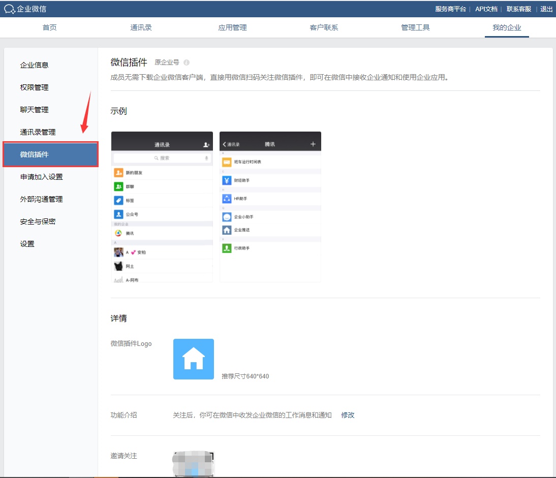 其实用个人微信接收到企业微信消息的办法很简单,只需要企业微信管理后台的「微信插件」功能就可以实现。管理员登录企业微信管理后台,在「我的企业」 – 「微信插件」页面