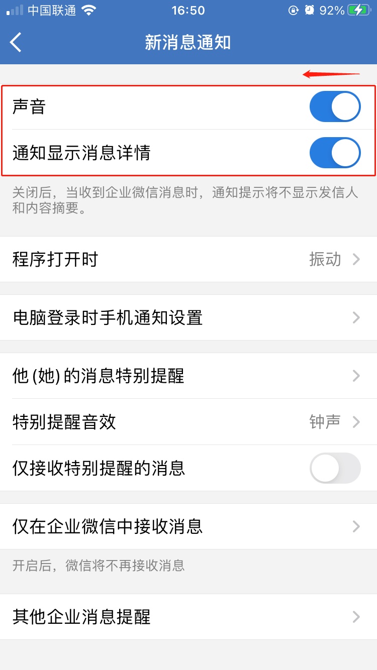 只需要再将里面的「会话消息」和「应用消息」按钮关闭,这样企业微信的会话消息和应用消息都会同步到微信显示,如果不想在微信显示,只需要将这两个按钮打开即可。