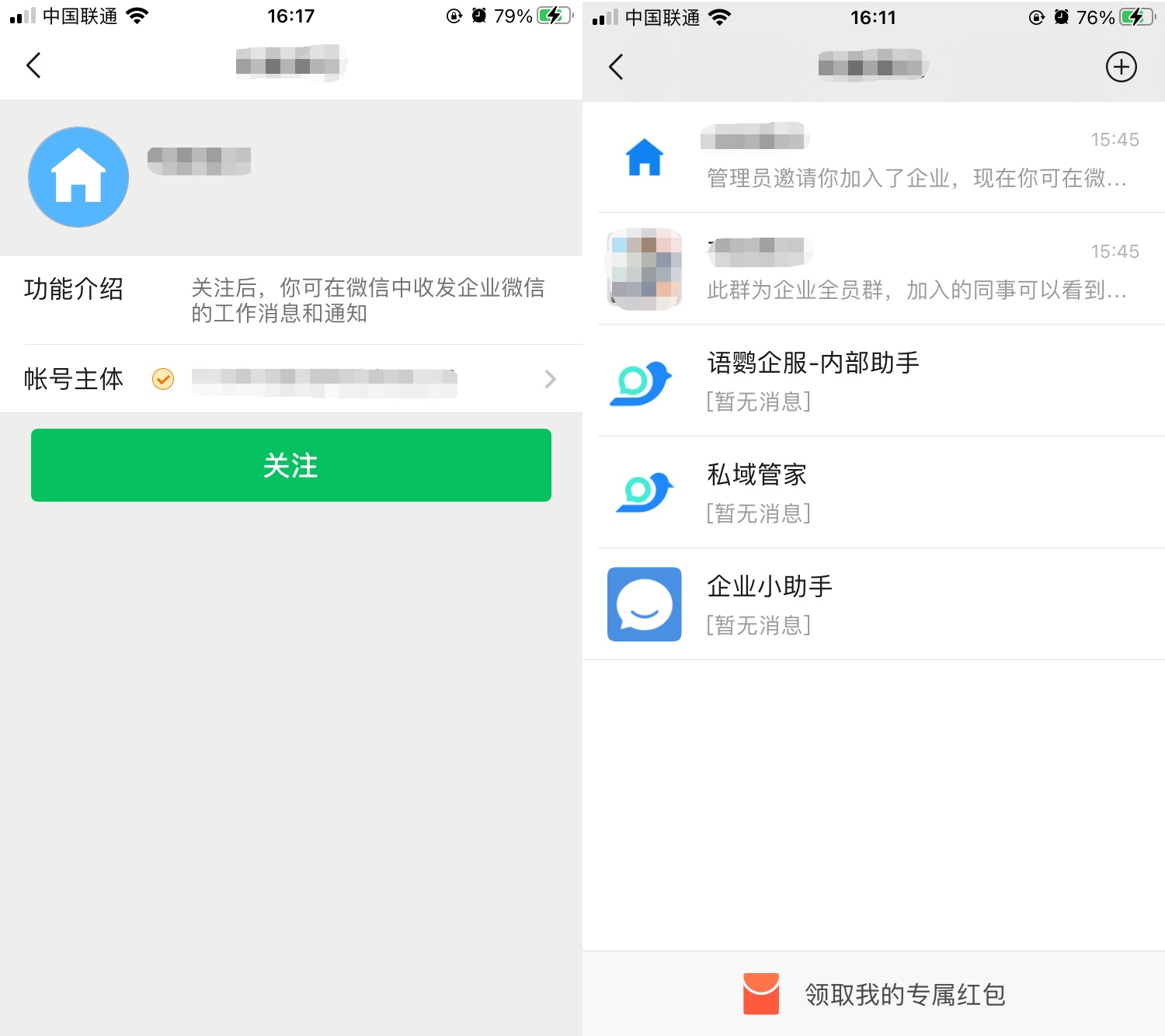 如果勾选了第2选项,则企业成员只能在微信插件收到提醒,想要收发消息则需要打开企业微信客户端。这样一来,员工关注后便可以在个人微信接收到企业微信消息啦!