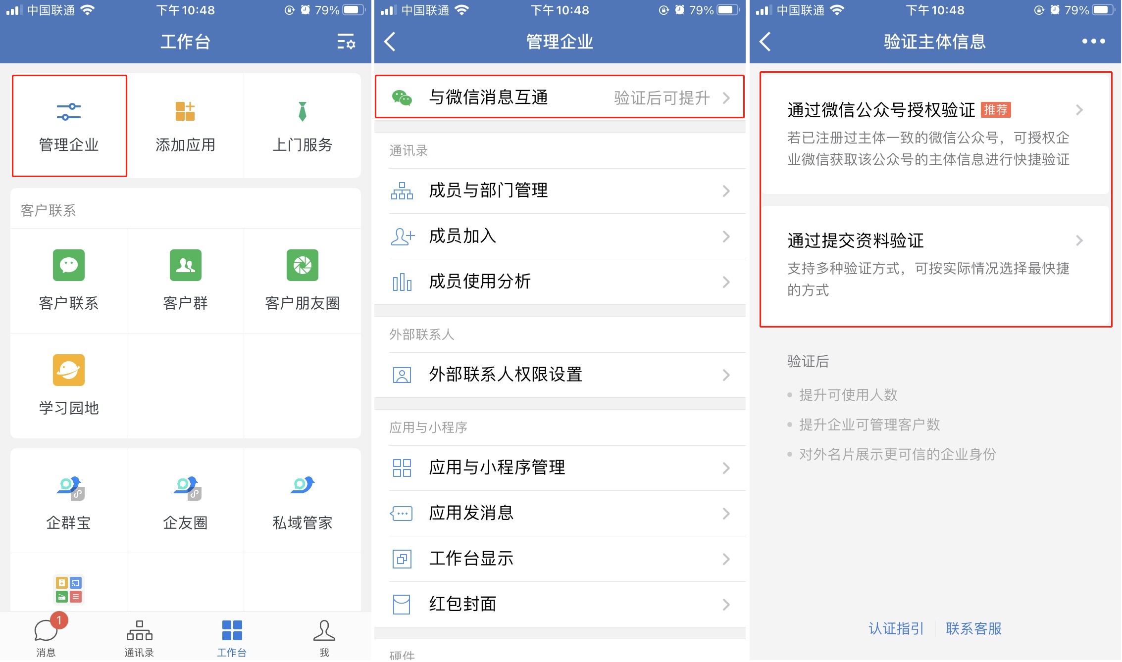 如果企业还没验证或认证,需要打开企业微信APP,在「工作台」 – 「管理企业」 – 「与微信消息互通」页面进行企业信息验证或认证。