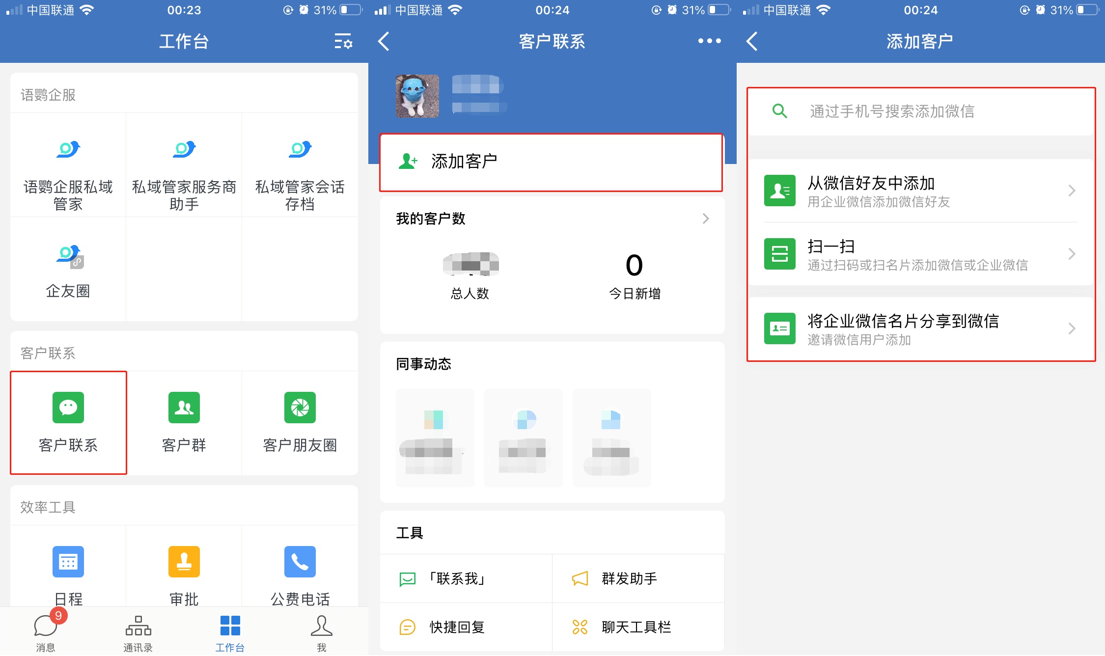 不只是个人微信能够添加企业微信好友,其实企业微信也可以添加个人微信好友的哦。打开企业微信APP,在「工作台」 – 「客户联系」页面即可「添加客户」。