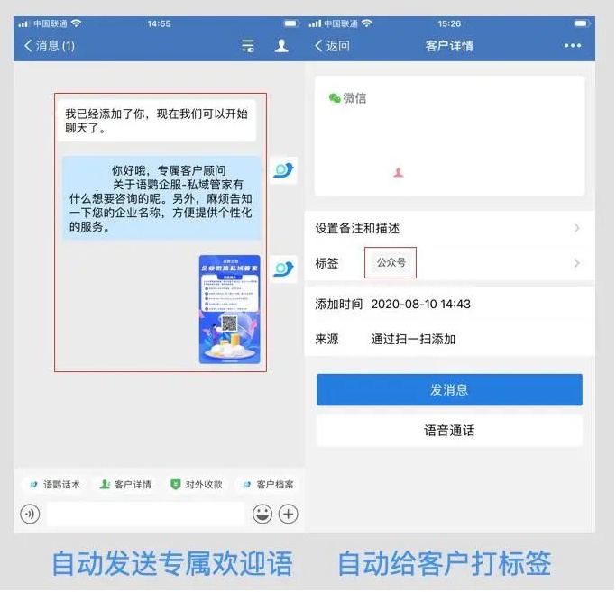 除此之外,对于普通的客户添加场景,比如主动搜索客户手机号添加、在群内添加好友,可以用到语鹦企服的「欢迎语」功能。它能够为不同部门、员工设置不同的欢迎语,可设置加好友自动打标签、自动修改昵称备注,如备注为「日期-群好友-用户昵称」,并且欢迎语支持发送图片、链接或者小程序+一段文本,让客户添加你的第一时间进行发送。