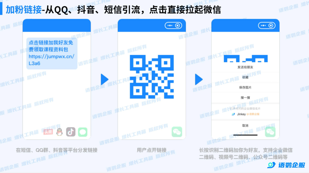 企业微信本身没有提供直接的加粉链接功能,但可以借助语鹦企服增长工具箱中的「加粉链接」功能来实现。这个功能将员工活码转化为可分发的链接形式,客户点击后会跳转到企业微信客服名片页面,扫码即可完成添加。相比二维码分发方式,链接形式更适合在抖音、快手、QQ、短信等不支持直接展示二维码的平台投放。