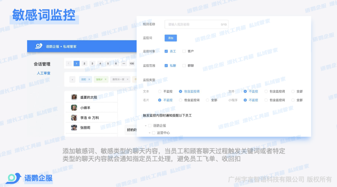 风险管控层面,语鹦企服支持设置敏感词监控,当员工聊天中出现「飞单」「加私人微信」等高风险词汇时,系统会实时预警通知管理员。即便是被撤回或删除的消息也能完整留存,帮助企业及时发现和制止违规行为。