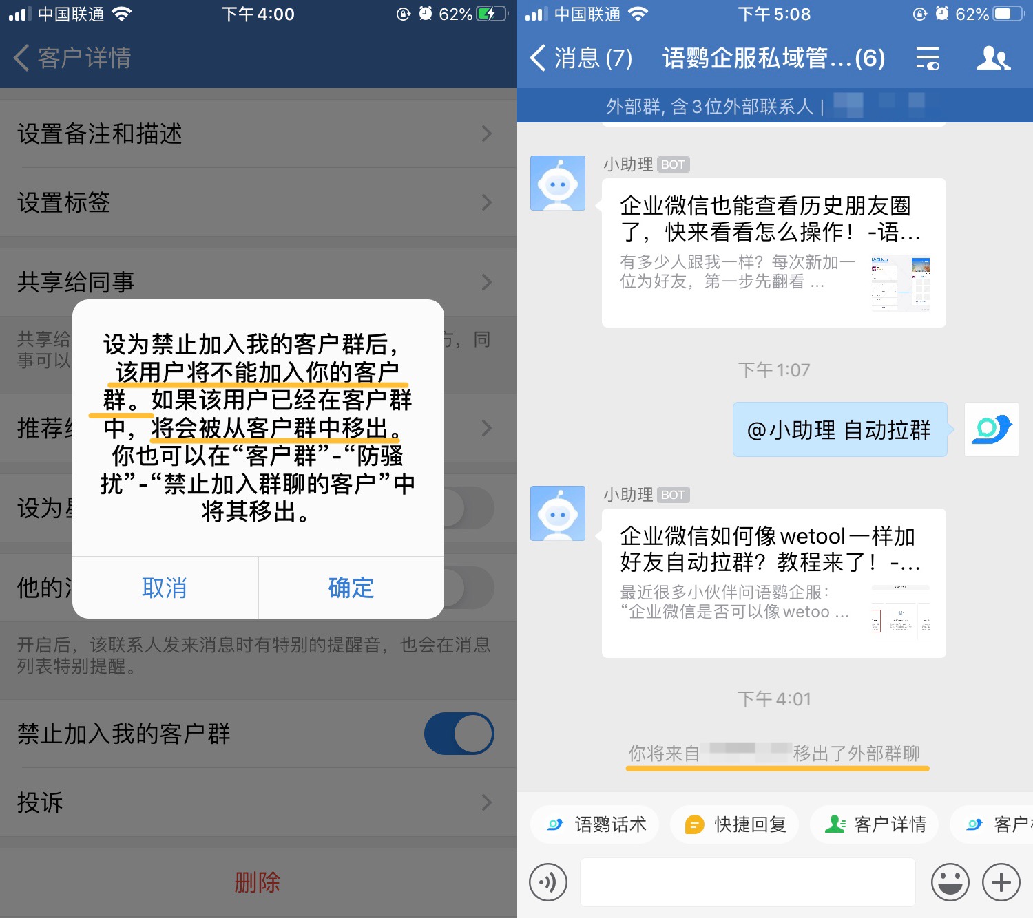 开启「禁止加入我的客户群」后,该用户将不能加入你的客户群,如果该用户已经在客户群中,将会被从所有客户群中自动移出,如果该客户再次入群,将会被立马动移除。