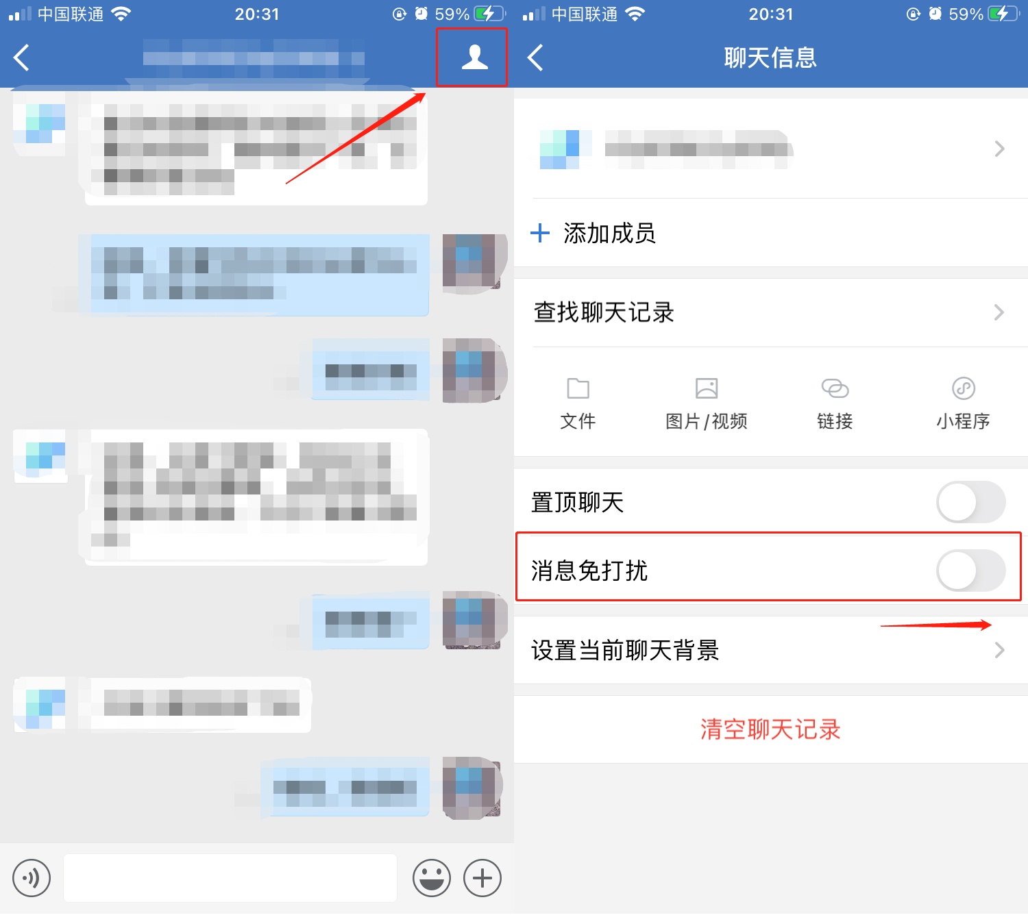 事实上,企业微信目前并不支持拉黑私聊好友,只能将好友消息设置为免打扰。如图所示,进入与好友的聊天对话框,点击右上角的小人头,进入聊天信息页面,打开「消息免打扰」按钮,即可屏蔽好友消息了。