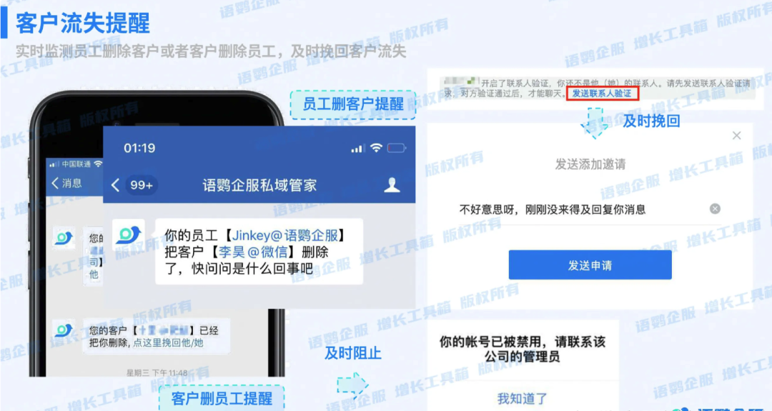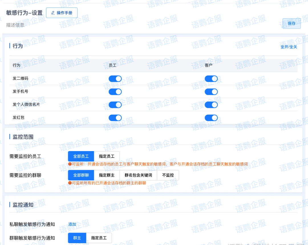 除文字敏感词外,发送个人收款码、删除客户、撤回消息等敏感行为往往更能暴露问题。语鹦企服支持对这些敏感动作实时监测,触发即刻通知管理者介入。