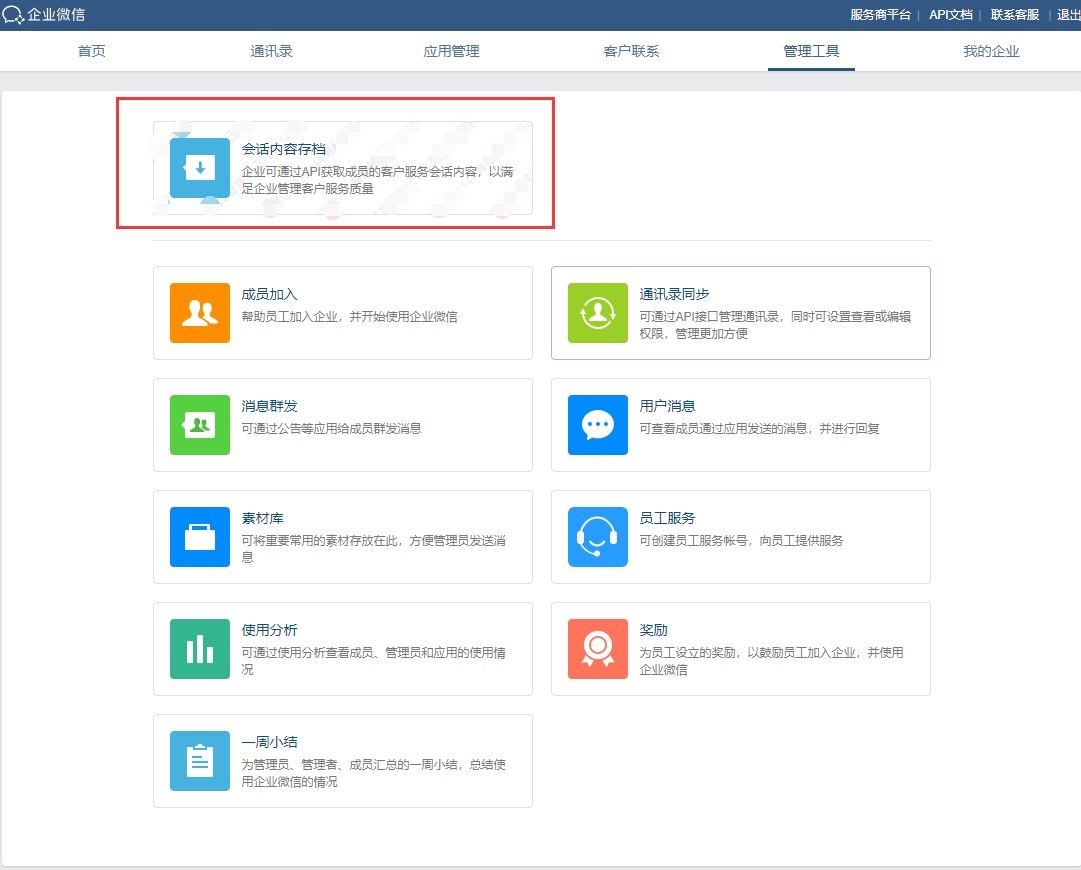 如果还需要监管员工与客户的聊天记录,还可以使用企业微信的「会话内容存档」功能,在企业微信管理后台 – 「管理工具」 – 「会话内容存档」进行开通。但需要注意的是,开通该功能,企业微信需要收取300/人/年接口费,并且企业微信只提供了该接口,如果需要使用该功能还需要进行二次开发,没有开发能力的企业可以联系语鹦企服进行开通使用哦。