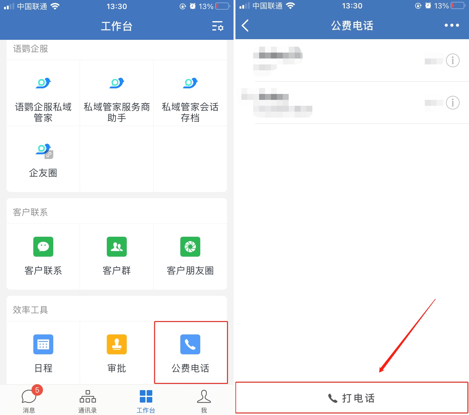 使用公费电话可以给同事或客户拨打电话,通讯费用由企业支付,拨打电话的资费是0.06元/分钟,比普通资费要划算很多。点击「工作台」 – 「公费电话」即可拨打电话