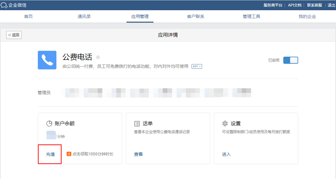 当余额不足时,可通知管理员登录企业微信管理后台,在「应用管理」 – 「公费电话」进行充值