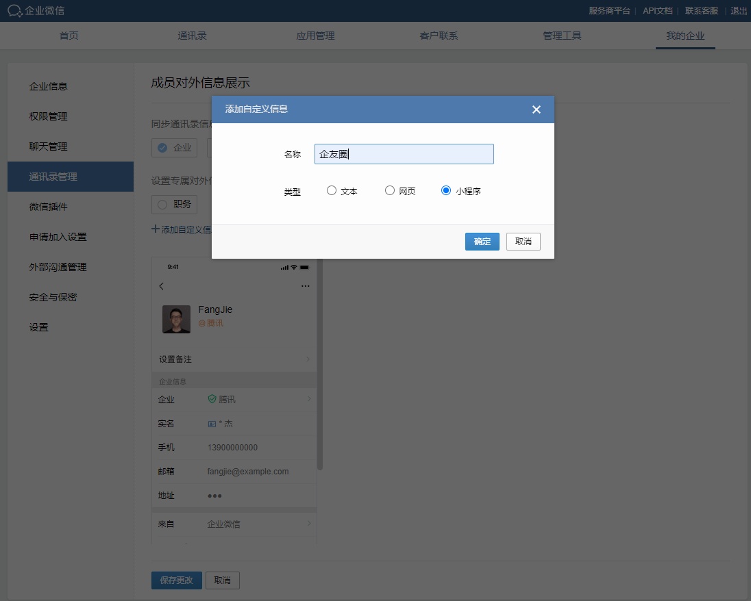 这里以设置小程序版本朋友圈为例。登录企业微信管理后台 – 「我的企业」 – 「通讯录管理」 – 「成员资料显示」 – 「对外资料显示」 – 「添加自定义信息」,如图,名称填写“企友圈”,类型选择“小程序”并确定。