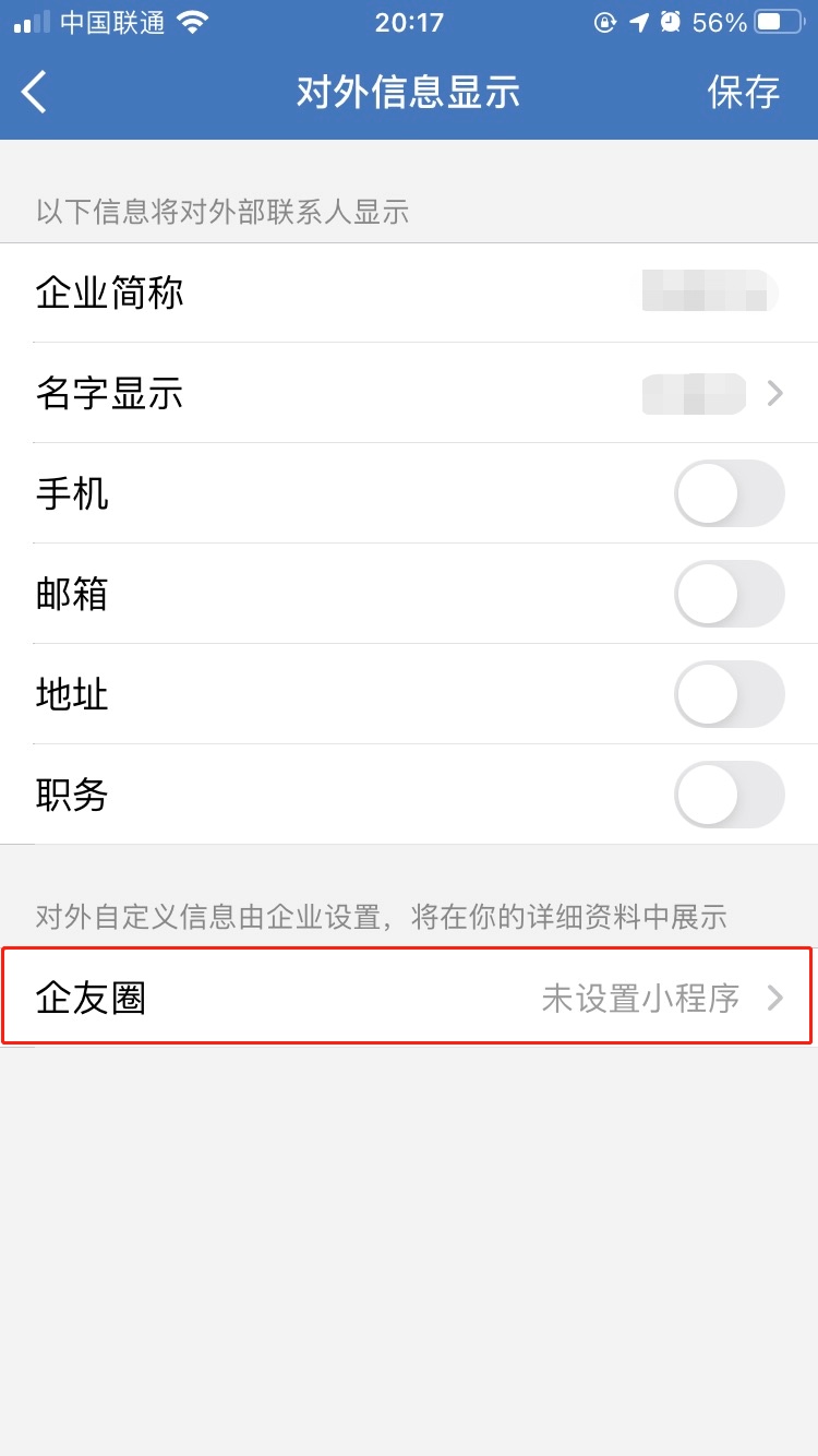 当添加好自定义字段后,我们就可以打开企业微信app – 「我的」 – 「个人名片」 – 「对外信息显示」,再添加企友圈小程序即可使用。