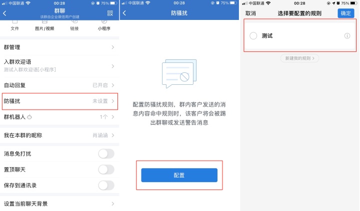 配置好后,群主打开企业微信app群聊 「设置」 – 「防骚扰」 – 「配置」,然后选择之前在企业微信管理后台配置好的规则即可。选择好后,当有人发送违规信息便会自动踢出群聊,并且无法再加入群聊。