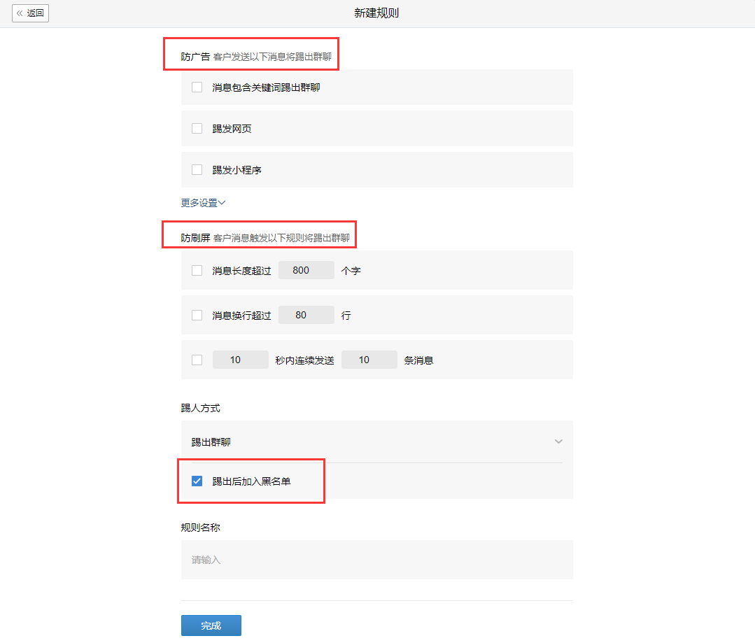 点击「配置」新建规则,在这里,我们可以选择需要的踢人方式,并且可以选择「踢出后加入黑名单」,这样被踢出群聊后就无法再次加入群聊。