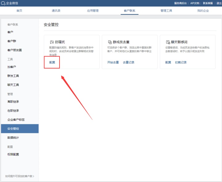 管理员登录企业微信管理后台,在「客户联系」 – 「安全管控」 – 「防骚扰」页面即可设置自动踢人规则