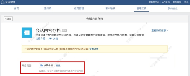 企业开通会话存档功能后,在自家企业微信管理后台就可以给对应的部门/员工开启会话存档功能,之后便查看查看该部门/员工的聊天内容。