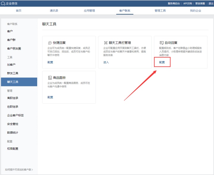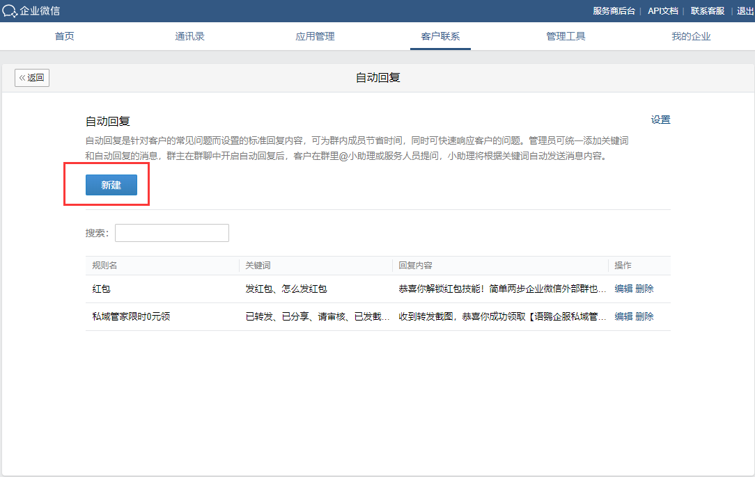 管理员登录企业微信管理后台,在 「客户联系」 – 「聊天工具」 – 「自动回复」模块即可创建关键词自动回复规则。